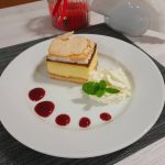 sernik pieczony według własnego przepisu podawany z musem truskawkowym i bitą śmietaną